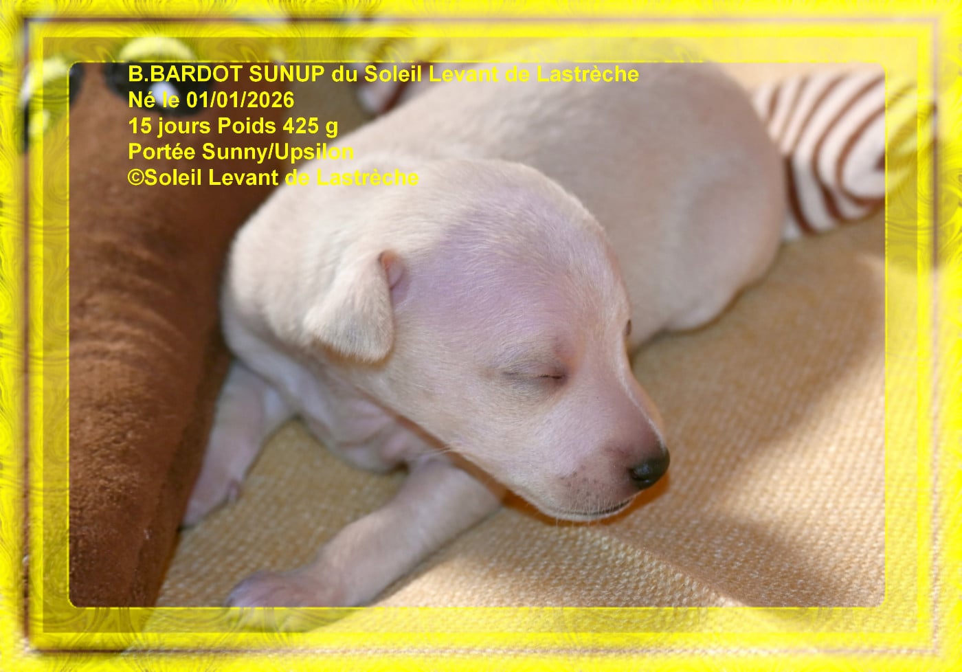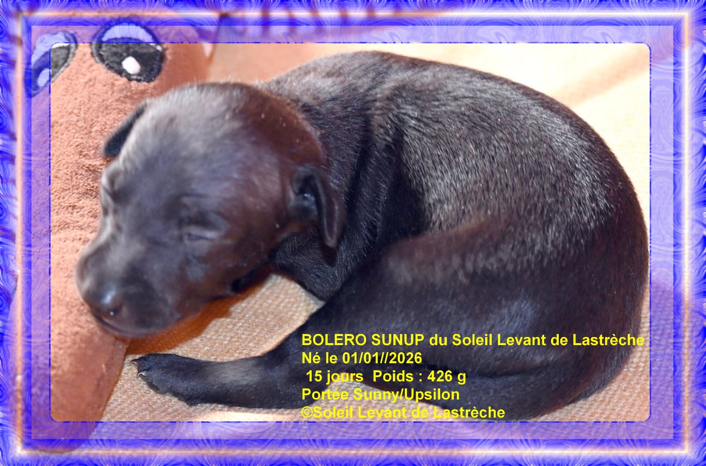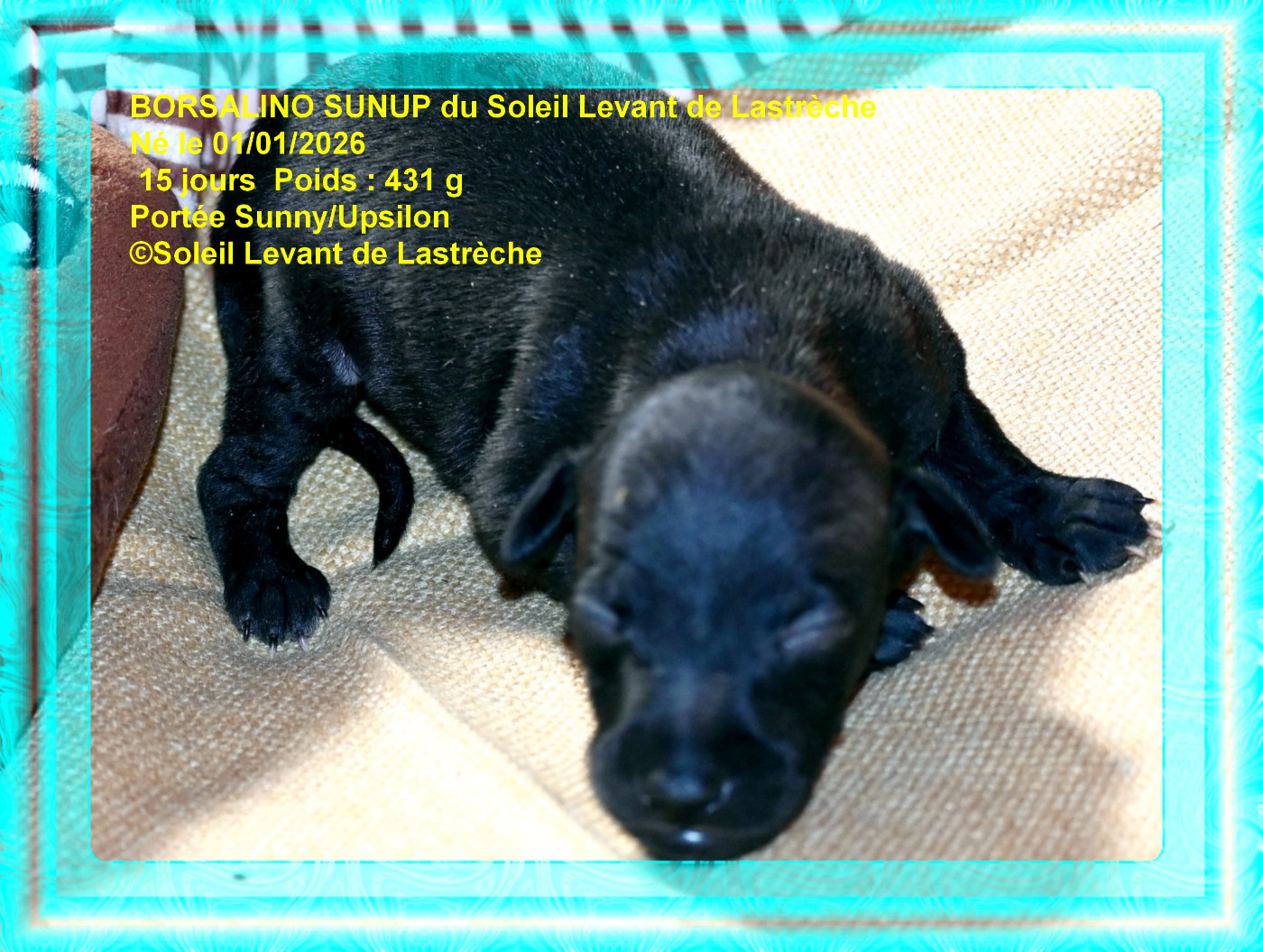La portée est inscrite LOF Les chiots seront identifiés, vaccinés, test ADN, passeport européen, certificat vétérinaire de  bonne santé, certificat de parenté, certificat de naissance. Départ des chiots à 10 semaines sauf export à 3 mois et 21 jours. Les noms sont provisoires. Le chiot pourra avoir le nom que vous avez choisi si la confirmation de réservation est confirmée et devra commencer par B millésime 2026.