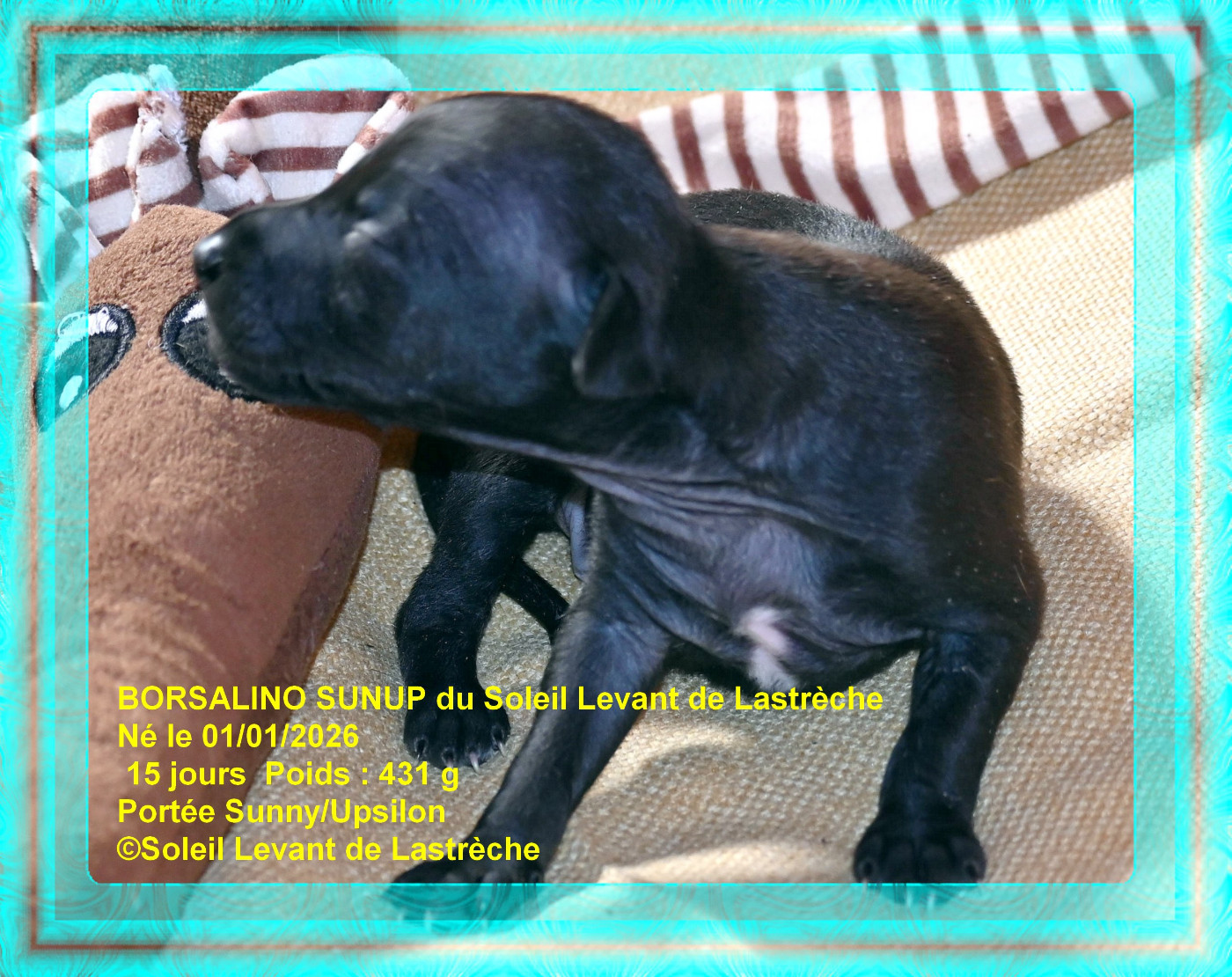 Mâle né en quatrième à 5h14 couleur noire, poids de naissance 191 g
