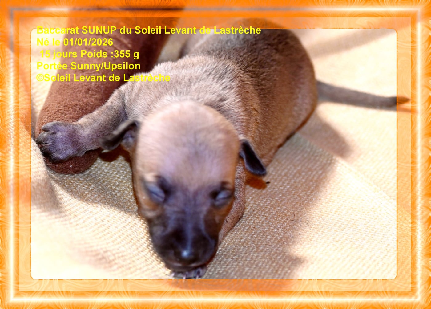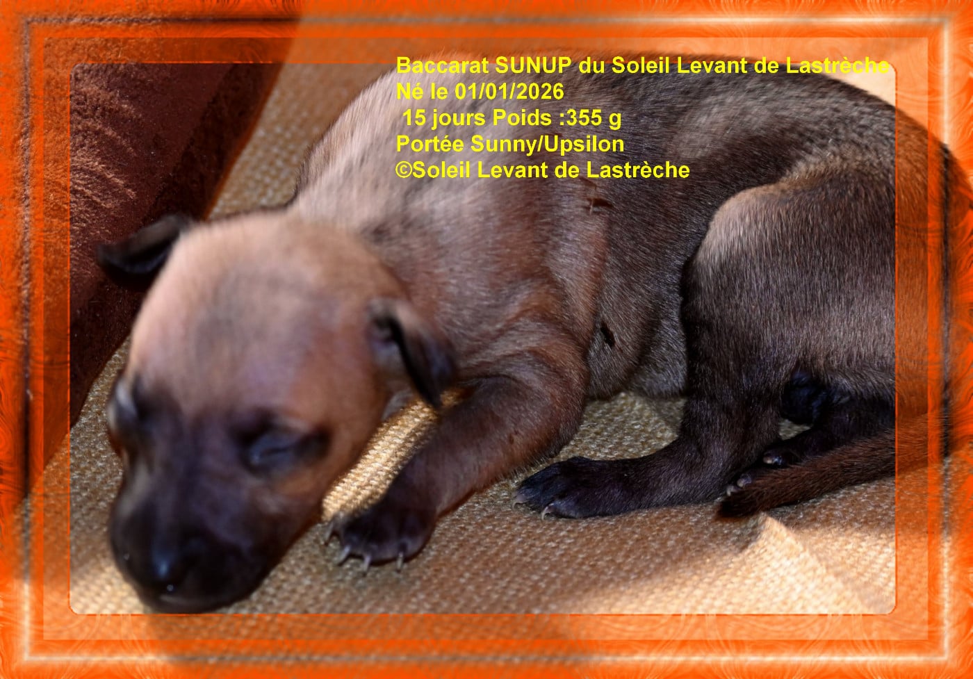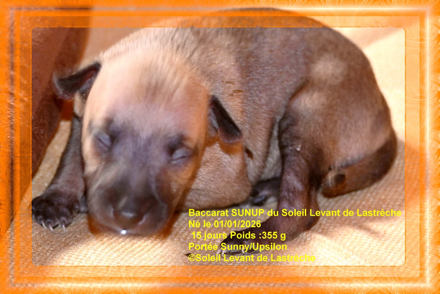 Femelle née en cinquième à 7h45, couleur fauve charbonné noir, poids de naissance 195 g